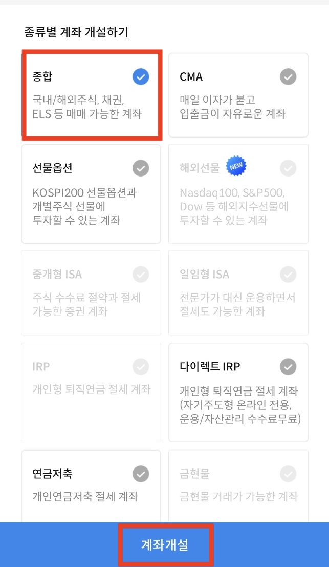 3. 국내주식, 해외주식, 채권 등을 종합적으로 매매할 수 있는 종합계좌를 체크하고 비대면 계좌개설을 진행합니다.